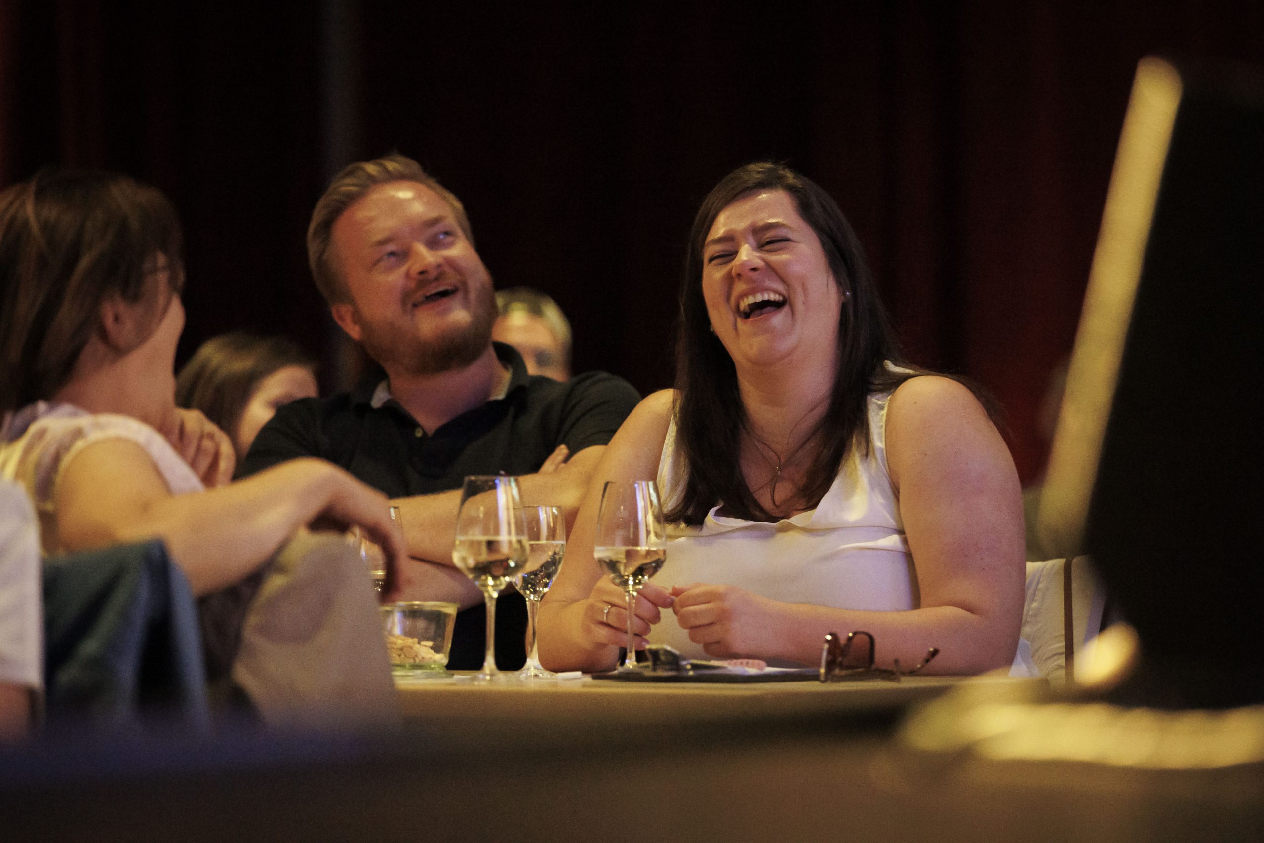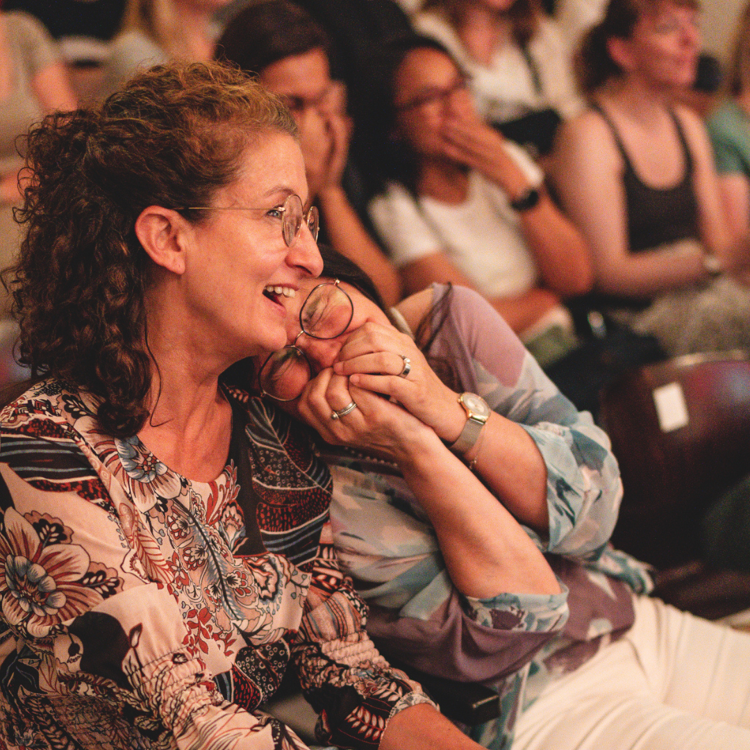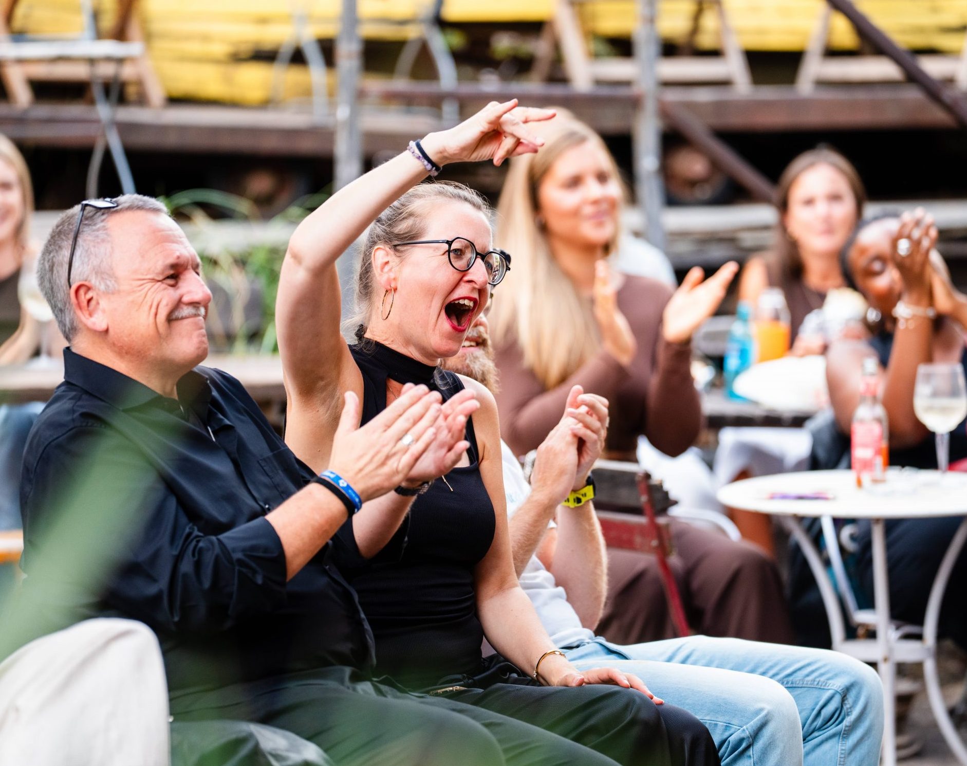 🤩 Immer mit dabei ist ein Comedian oder Comedienne, der oder die das Publikum anschließend zum Lachen bringt – Humor ist schließlich, wenn man trotzdem lacht.